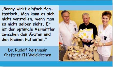Wie wichtig solche Schmusetiere für verletzte oder in Not geratene Kinder sein können dokumentieren zahlreiche Aussagen von Kinderärzten, die unseren „Benny“ bereits als Begleiter verletzter Kinder eingesetzt haben. Danach verhalten sich die Kinder viel ruhiger, verlieren einen Teil ihrer Angst und können mit Schmerzen besser umgehen. Zudem berichten die Ärzte weiter, dass sie dadurch weitaus weniger Beruhigungsmittel verabreichen müssten.